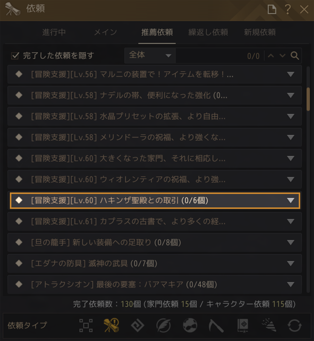 • 依頼「[EV] ハキンザ聖殿との取引」の位置が依頼(O) - 推薦依頼タブへ変更され、依頼名も「[冒険支援][Lv.60] ハキンザ聖殿との取引」へと変更されました。
