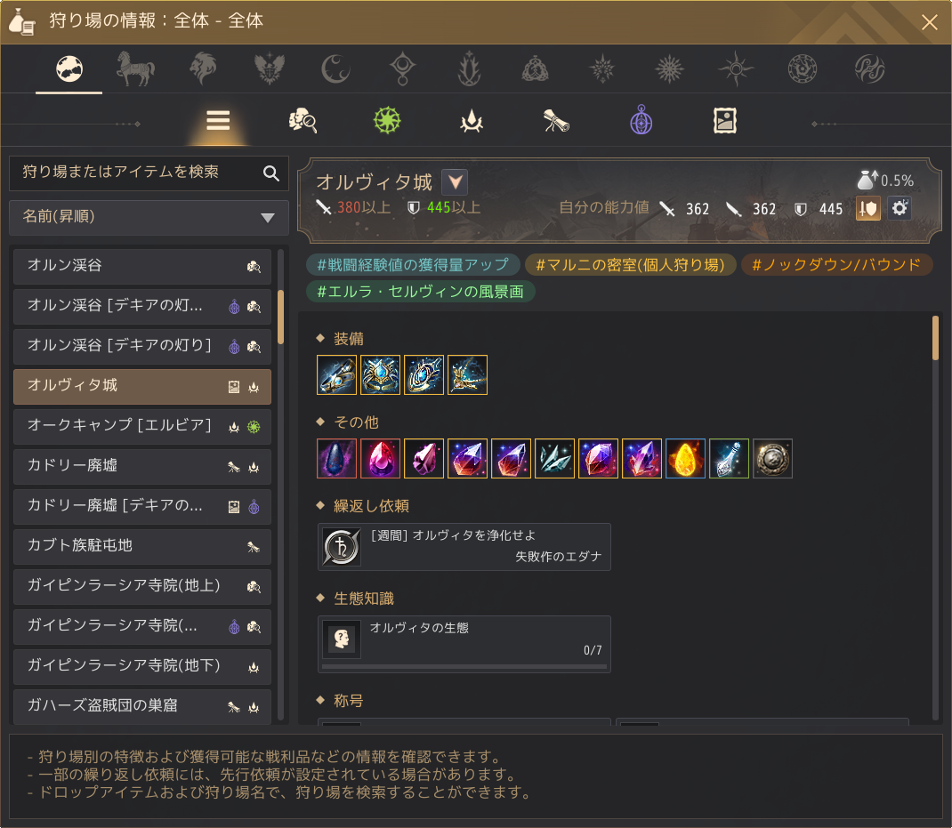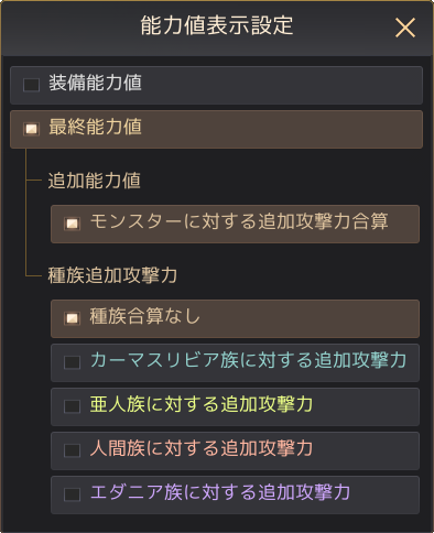アイコンをクリックすると、目的の狩り場の特性に合わせて自分の能力値表示を変更できます。