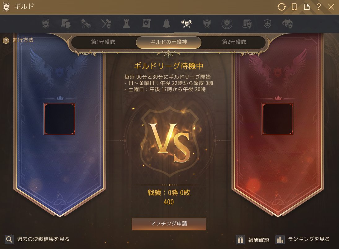 - ただし、占領戦/拠点戦の開始直前にギルドリーグのマッチング申請を行った場合、占領戦/拠点戦の開始時間(拠点戦は21:00、占領戦は20:00)にギルドリーグが1回進行されます。