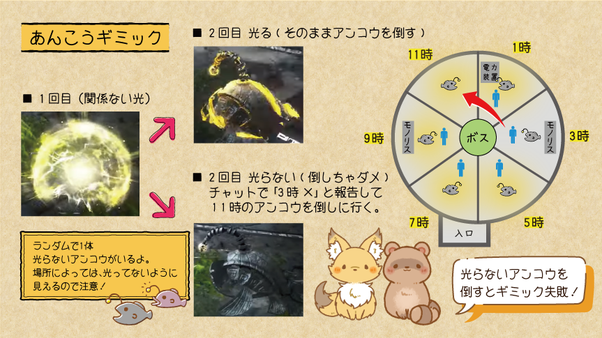 光ってないアンコウを倒してしまうとギミック失敗で即死攻撃が来ます。