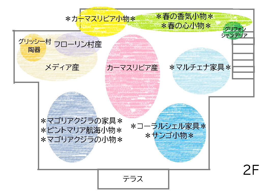 建物わきの空きスペースに、荘園家具、一部店売り家具の展示を行っております。