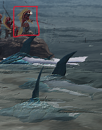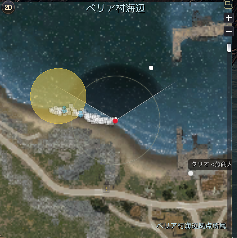 クリオを背にして左側に視点を回し、怪しげな魚の向こうにある岩の上で釣りをしている赤枠の人です。