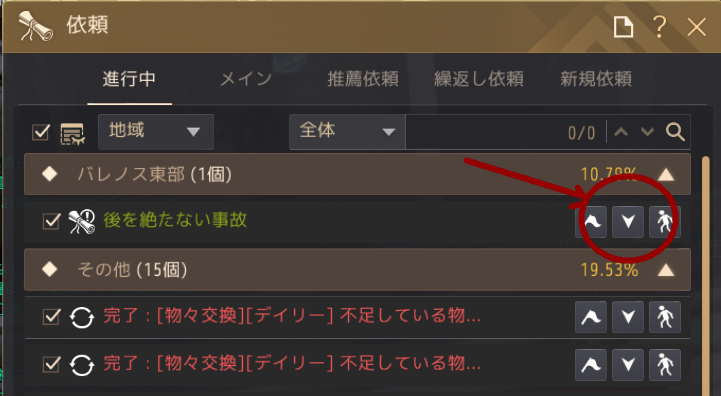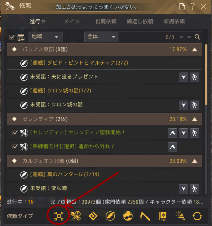 Oキー依頼一覧から、進行中の依頼に載っているこの下矢印キーを押して、ルートをしいて行くのが確実かなと思います。馬などに乗っていると「搭乗物から降りた後依頼が進行します」のような表示が出る場合もあり、そのときは降りてください。
