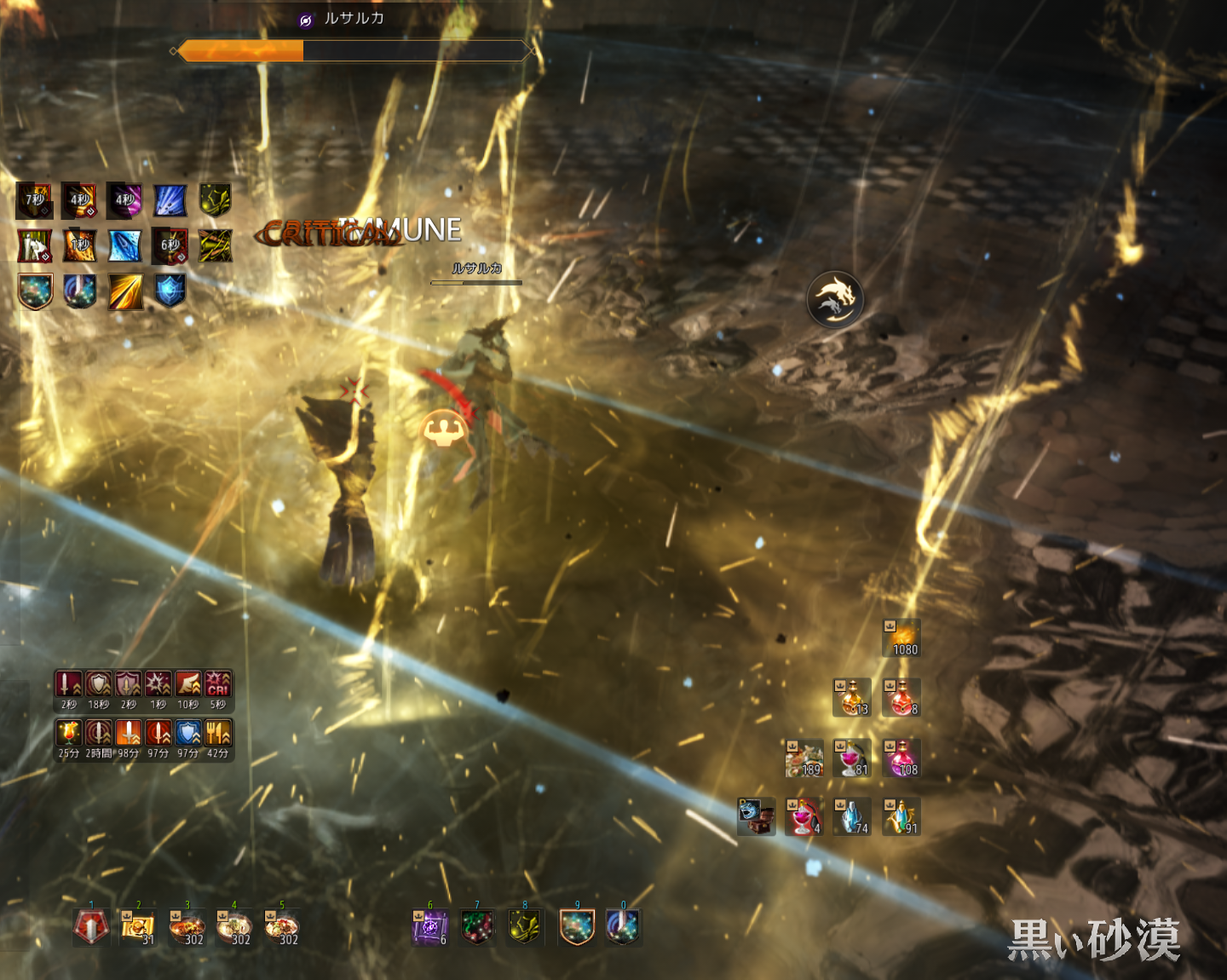 ちょっとわかりにくいですが、地面の左右にAOEが出るので、基本真ん中で戦っていくことになります(金色のはうちのキャラの攻撃なので気にせず……)