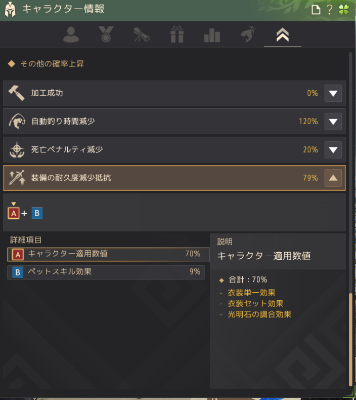 リュックと衣装8カ所と鍛冶屋の祝福合わせて装備耐久度消費量-79%。