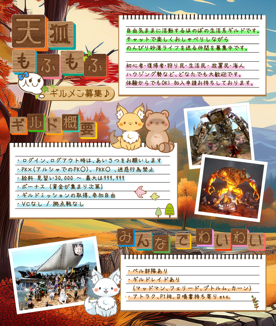 ゲーム内【Gキー】→【ギルドメンバー募集】→【生活】→【天狐もふもふ】で検索 →【加入申請】をお願いします。