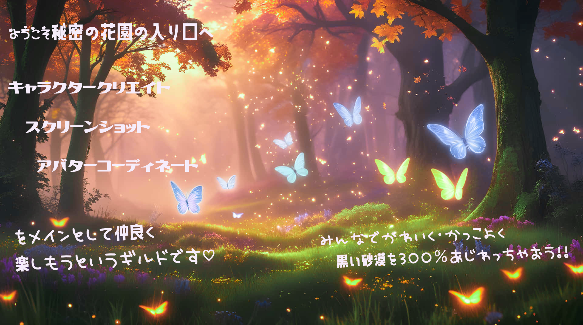 そして同じ趣向の方が集まり、好きな話題で盛り上がりつつ戦闘や生活、冒険をしながら私たちだけの麗しい【秘密の花園】を作り楽しんでいきましょー!!というギルドです
