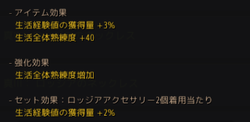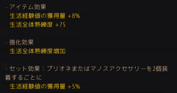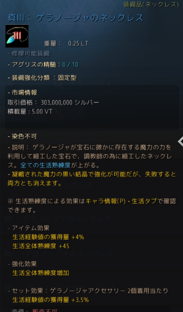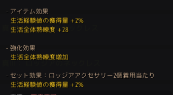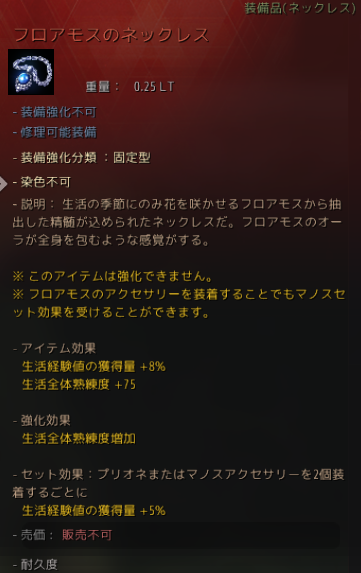 アクセサリーがいかにコスパが悪い(ご指摘により表現書き直し)かがわかると思います。その分、1つ持っていればすべての生活系の熟練度なり獲得経験値があがるということでもありますが(これは生活水晶も同じ)ただやっぱり、優先順位として前にもってくるにはあまりにもコスパが悪い。アクセは6箇所装備できるのですが、それは値段も6倍かかるということですからね……。