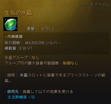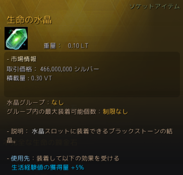 生活水晶は基本割れることがないので(戦闘しないから)、ちょっとずつ買っていくのもありかもしれません。熟練度と経験値どちらを選ぶか(生気と生命)の選択はありますが、私は生活初心者さんには経験値(生命)をお勧めします。やはり生活レベルを早くあげたいので。