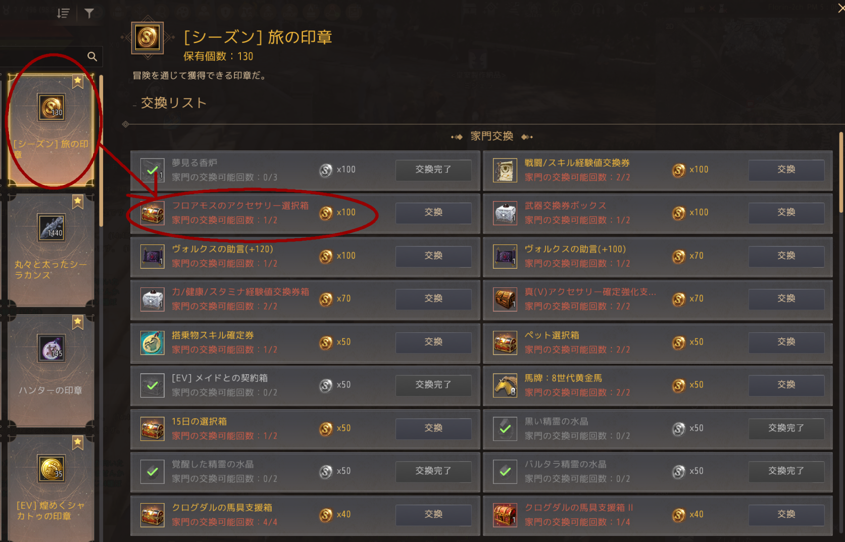 通常画面上方にある財貨リストから、シーズンパスを進めることで手に入る[シーズン]旅の印章の交換で手に入る2つ。