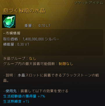 その上位のどちらもあがる緑陰の水晶については、今の状態では手が届かない……かな、と。取引所でもすごい数の予約が入っていますし、自作するならエダニアまで行かなければなりません。絶対に自作は無理とは言いませんが、その場合も生気と生命の水晶を両方使って新しい水晶を作るという形になるので、まず生命や生気の水晶を買っておくのは無駄にはなりません。
