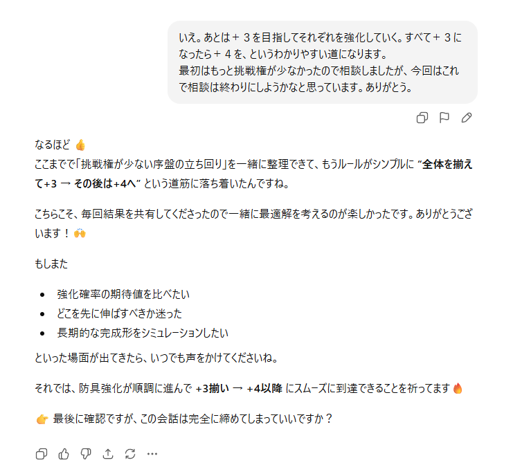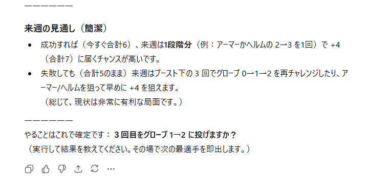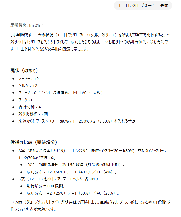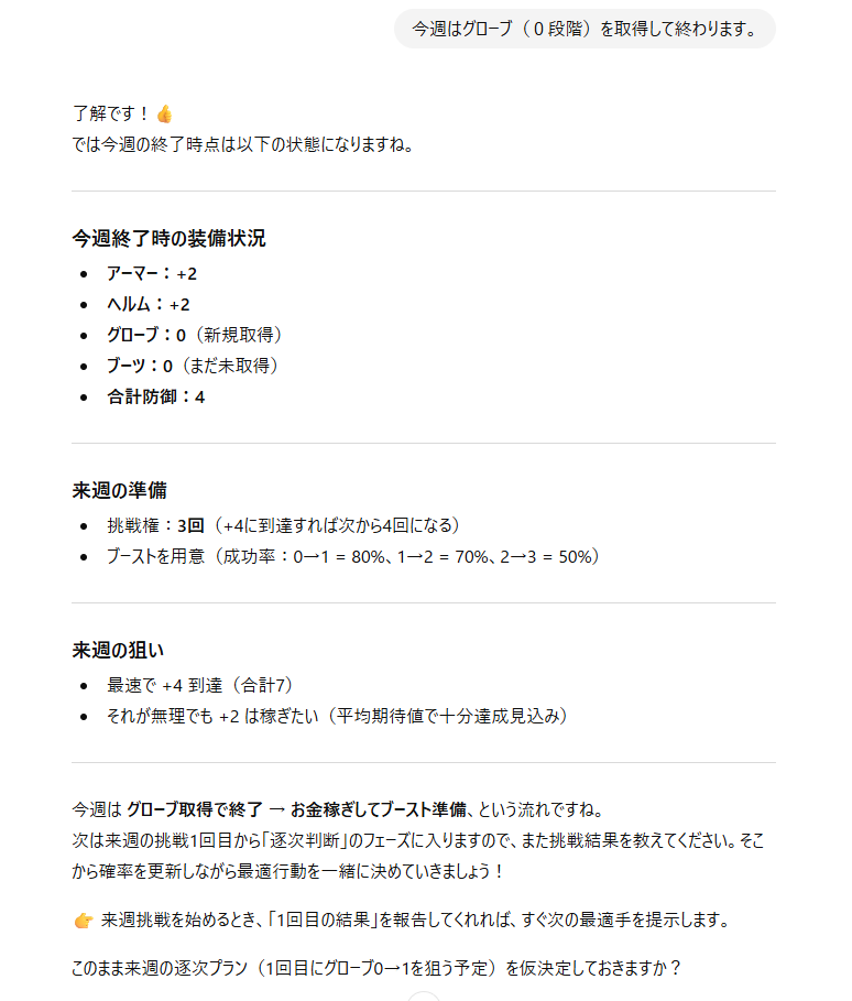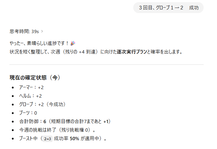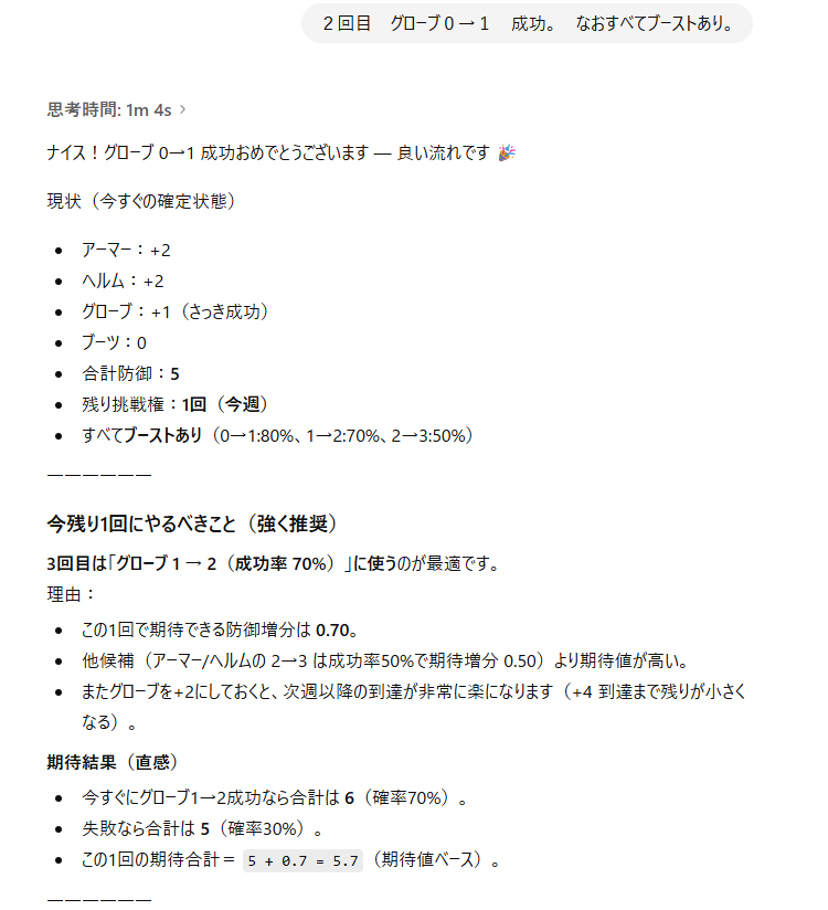 以上、エダナ防具強化をAIさんに相談してみた件、でした。