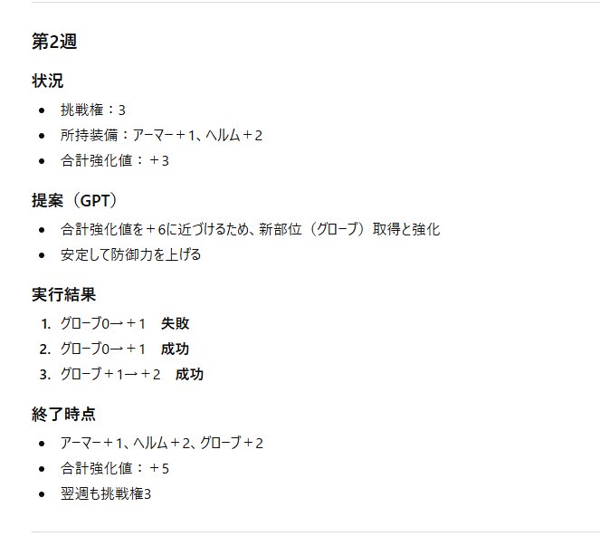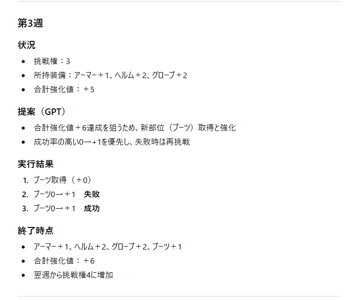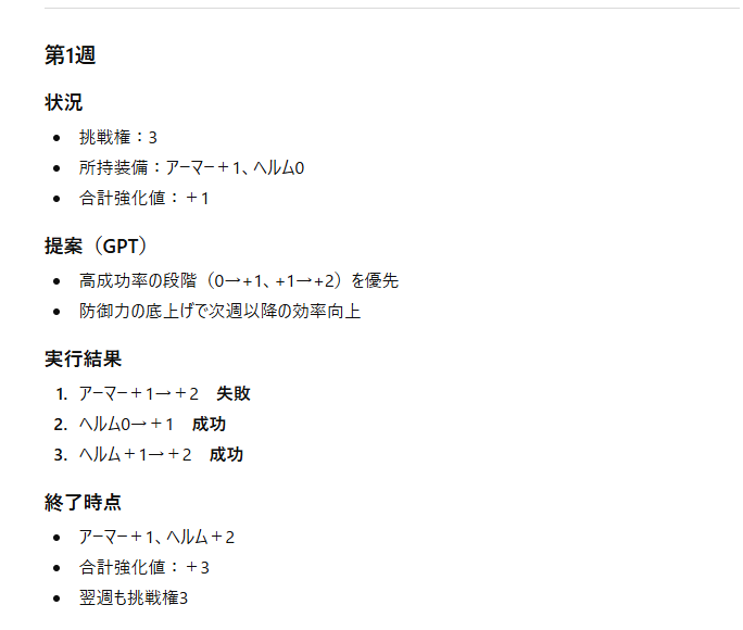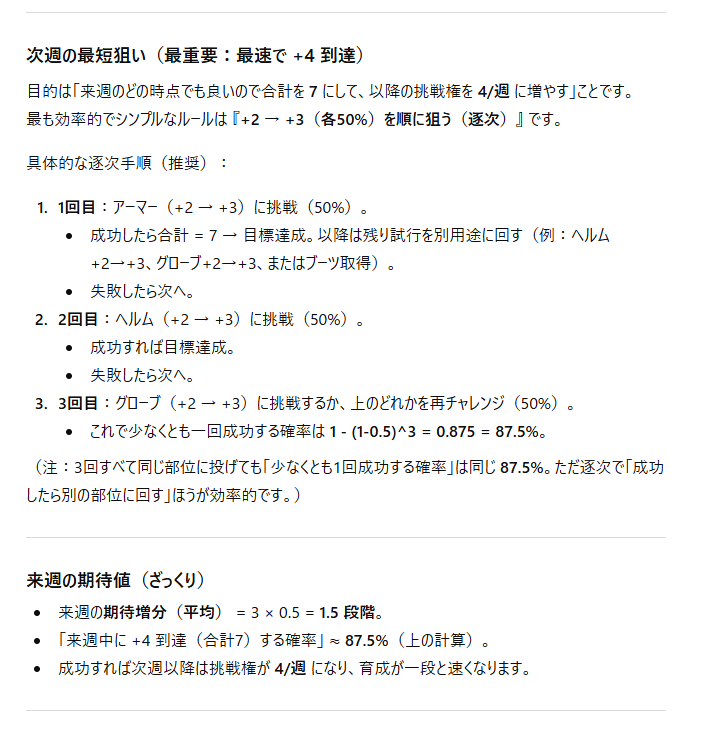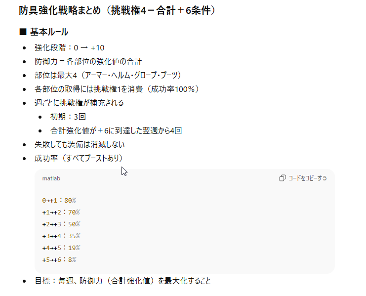 エダナの防具を獲得&強化するにあたり、毎週ごとの防御力増加が一番見込めるプランをAIに提示してもらいました。