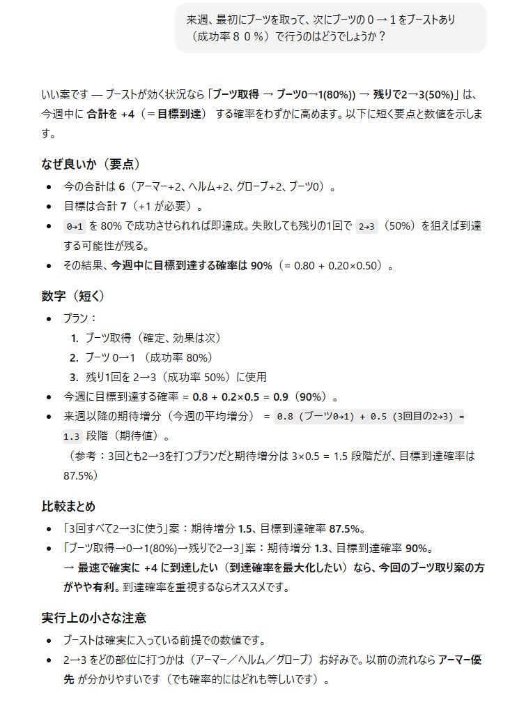 確率計算などはわりとAIの得意分野に思えますが、結構こうしてあっさり間違える’(見落とす?)、というのも使っていてわかったというか勉強になったところです。ただ原因は私がきちんと指示を行えていなかったのかな、という内省ももちました。しかし即座にAI側が提示していたルートでの成功確率と、こちらが提案した成功確率を計算して比較してくれるのは、仕事デキる感。