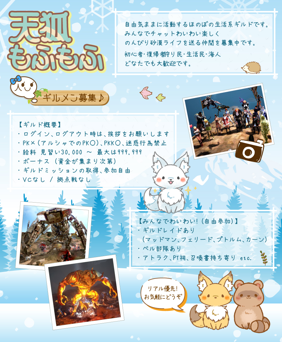 私が所属している【天狐もふもふ】では、まだまだギルドメンバー募集中です。