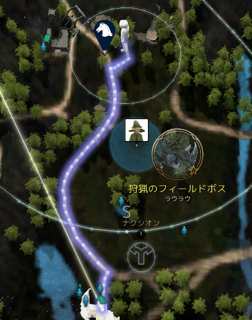 狩猟デビュー第3弾としてお伝えするのは、リアナから受けるデイリーの狩猟クエ「野生のナクシオン」です。この狩猟は、オドラクシアの少し西、フィールドボスのラウラウが出没する場所の近くです。マップでは、ラウラウのマークが見えるので、そこを目指していくか、死の月警戒所の厩舎番の白いカエルを目指して行きます。
