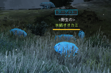 こちらが<野生の>氷結オオカミ。このオオカミは取殺して肉や血をゲットできます。かなりの数が一緒にいるので、気を付けて狙ってください。