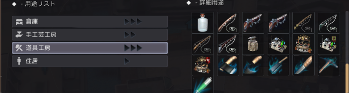 右上に、用途名の検索ウィンドウがあるので、そこに「道具工房」と入力して検索すると、青い矢印で表示されます。