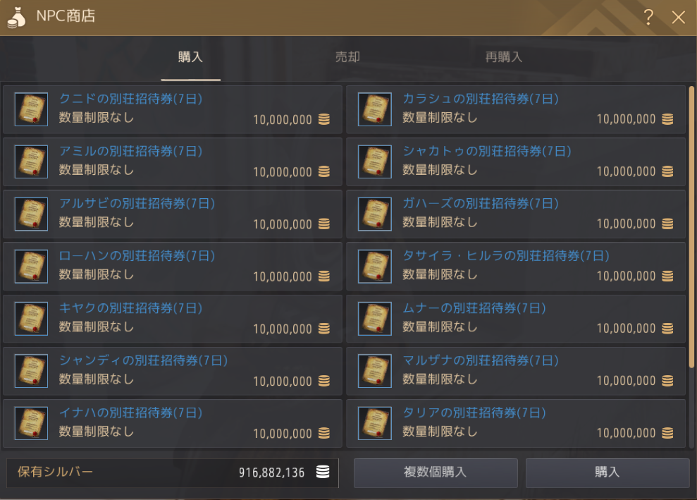 この招待券という名の利用券を持っていないと、別荘バフを利用できません。そして期限が7日なのですが、つまりは1週間に1度家門の誰かが買えばおkです。ただ、別荘バフを使う人がこの招待券を持っていないといけないので、そのあたりは倉庫やメイドを通じてのキャラ間での受け渡しが必要になります。