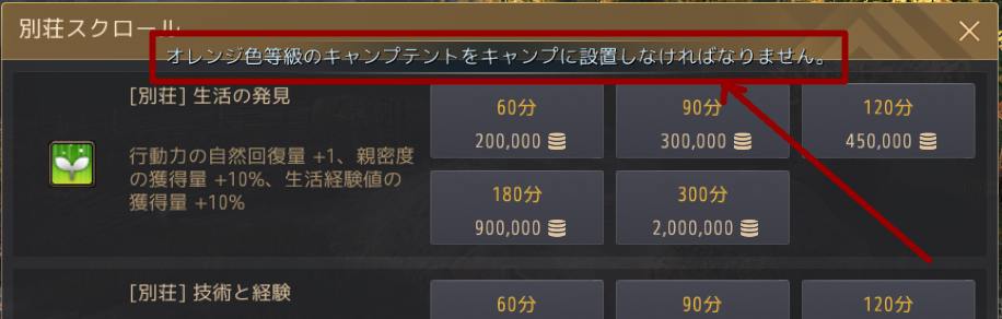 この別荘スクロールについては、課金テントあるけど終末バフはない、という人はテントを開いて別荘バフのところからは付けられるけど、スクロールは買えないという感じになります。