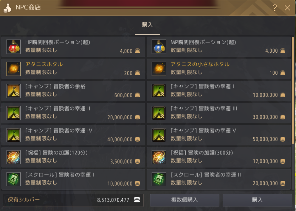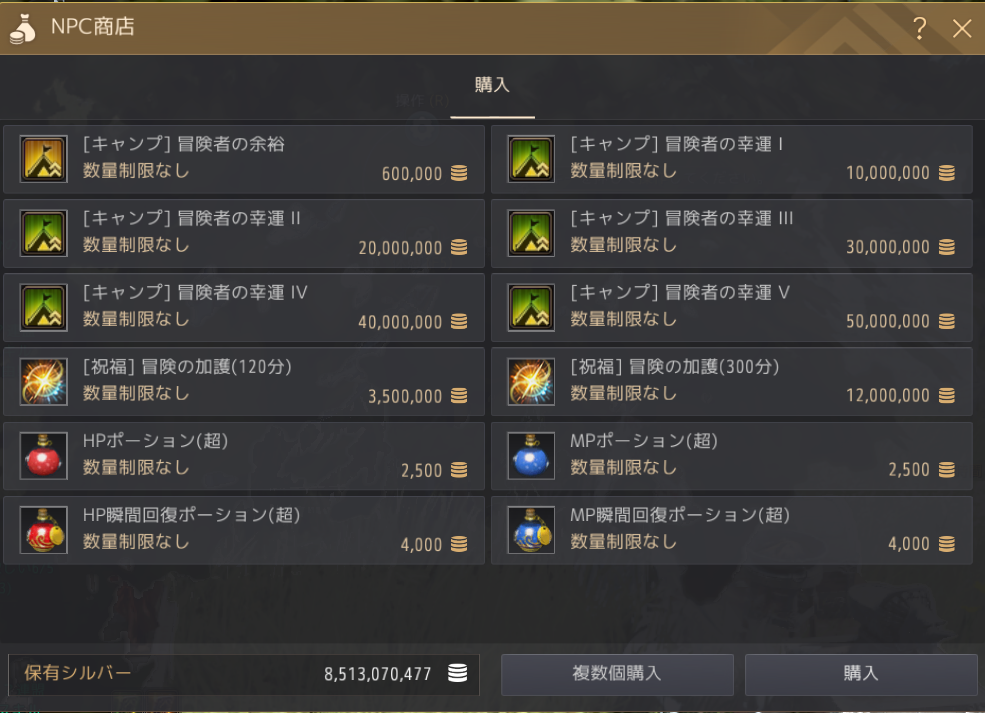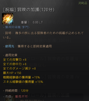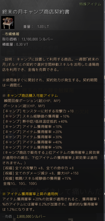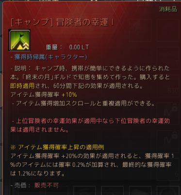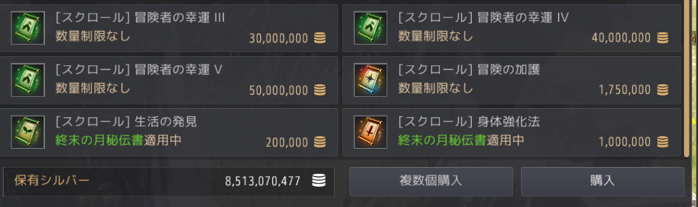値段もかなりするのですが(1で1千万シルバー、5だと5千万シルバー)、狩りの効率(収入)や他では手に入らないアイテムのドロップを目指しているなら、とてもありがたいバフです。