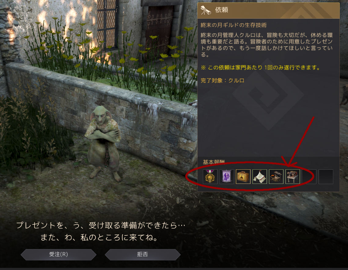 この方が無課金テントをくれるのですが、依頼自体は話しかけて、心の準備をして(そう指示される)、もう一度話しかけるだけで終わります。