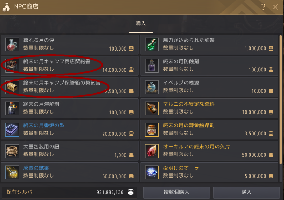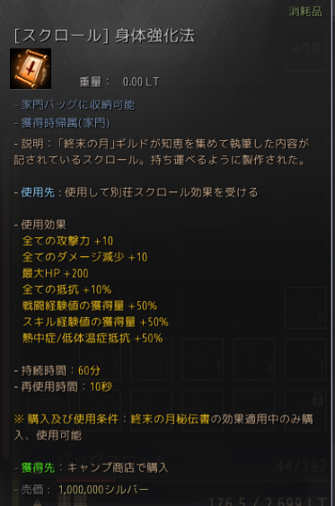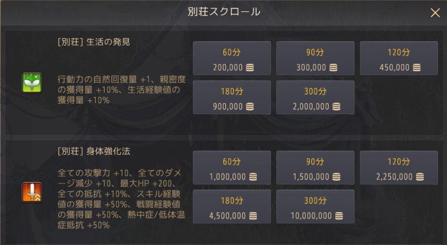 そして一番下の段2つは別荘バフとして紹介したものですが、「終末の月秘伝書」という基本課金の常時バフ(前述)を付けている人だけはスクロールの形で購入できます。