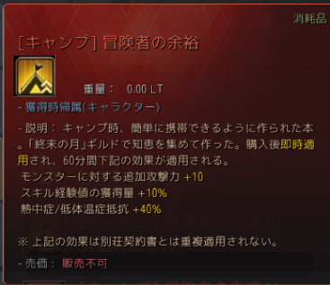 この別荘バフもテントの大きな魅力の一つで、身体強化法は攻撃力アップだけでなく、状態異常への抵抗も10%あがるのが強いです。狩り場に必要な抵抗を100%にしたい場合、かなりこの10%は大きい。さらに31日のアプデで、従来「技術と経験」で別のバフとして存在したものと統合されたので、効力も上がっています。