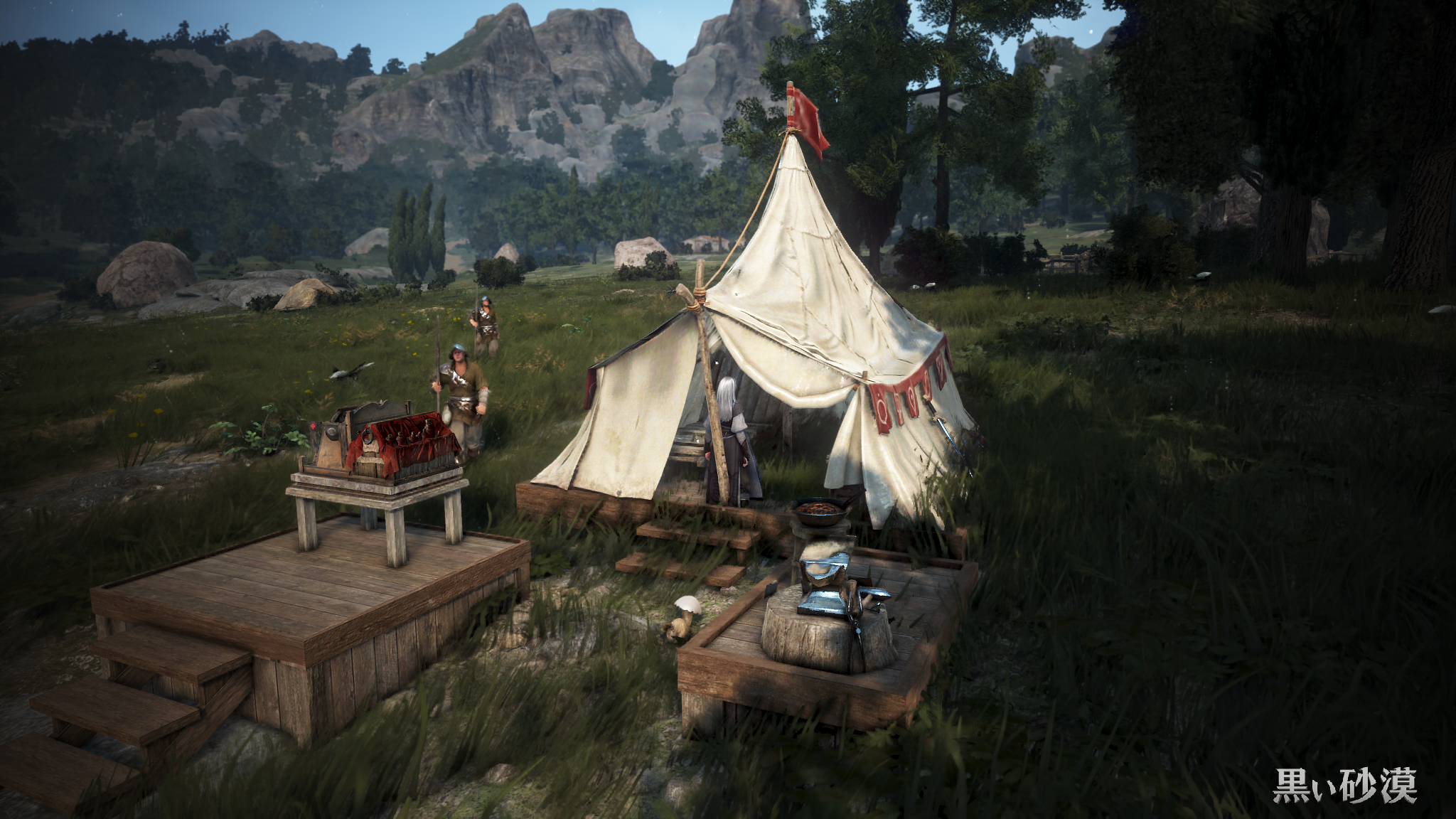 それと生活系のバフがあるのもよいところ。生活系の人も、採集をしていると採集道具の耐久を消費しますし、釣りだと釣り竿の耐久、狩猟だと狙撃銃や火縄銃の耐久が消費されていきますが、テントがあればどこでも修理可能+生活系のバフつけられますという。