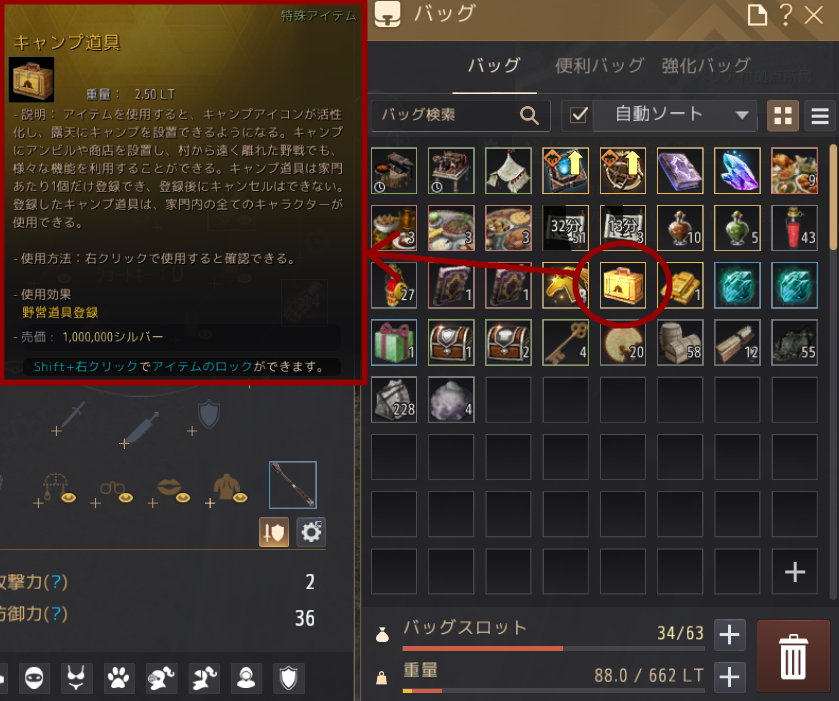 使用方法は最初にまず、バッグに入っている「キャンプ道具」を右クリックします。