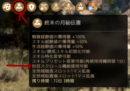 ただこの別荘バフには一つ難点があって、「終末の月の秘伝書」という常時バフ(基本課金)を使用している人は問題なく使えるのですが、