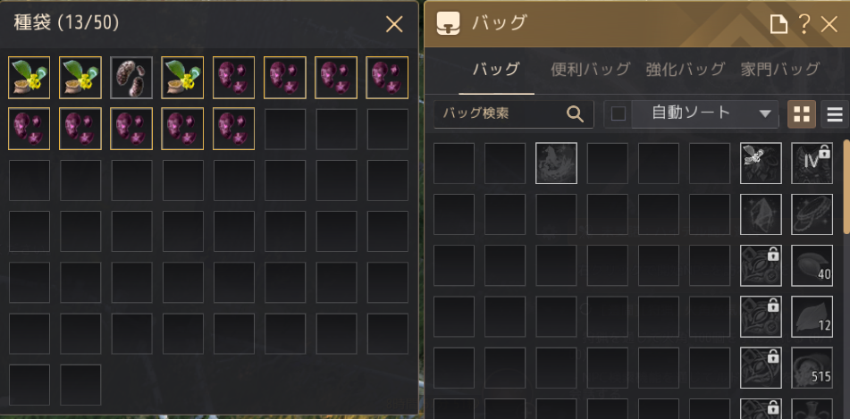 また、種はバッグの中でスタック(一種類につき1マスで数だけ重ねる)できず、20個の種を持とうと思ったら、20マス要ります。