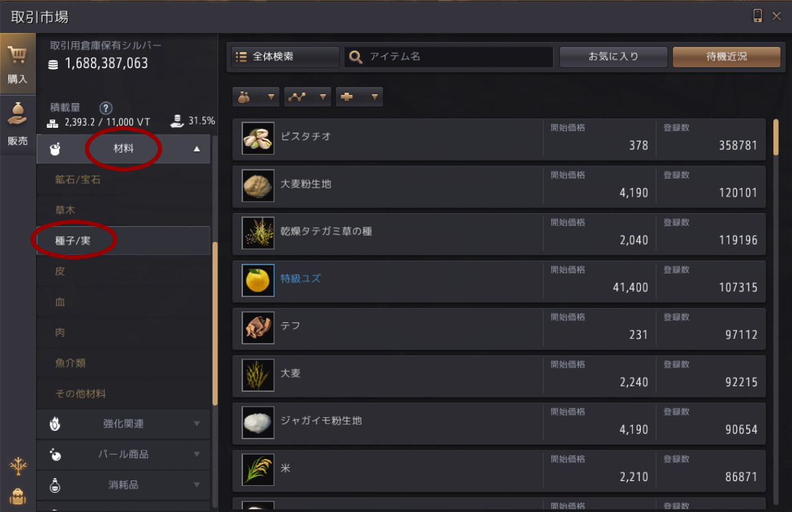 あるいは取引所で買う(材料カテゴリの種子/実から)