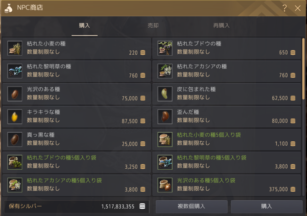 種は種子商人という人が居て(NPC検索可能)