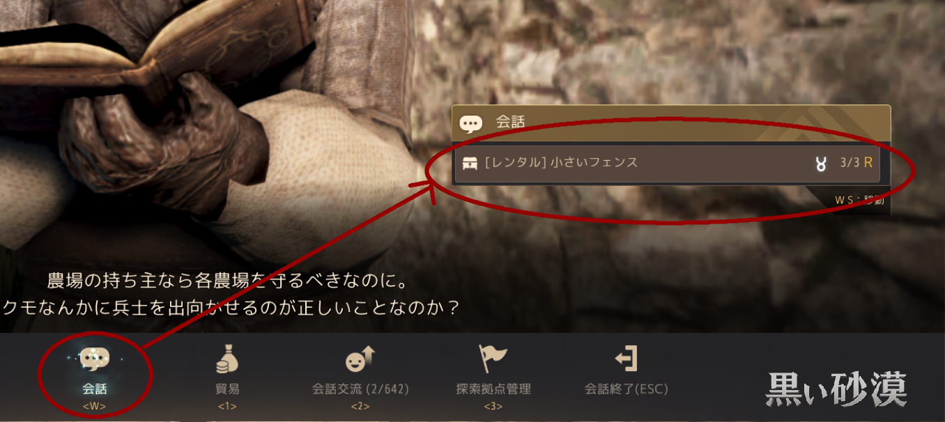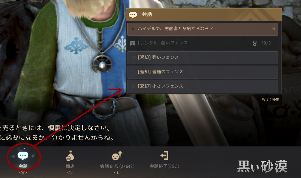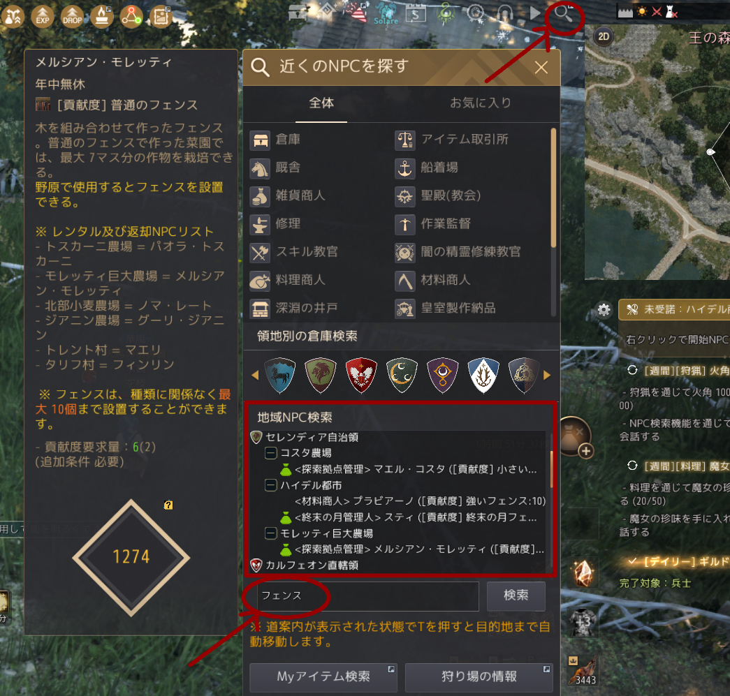 フェンスはNPCから貢献度を払ってレンタルするのですが(返すと貢献度は戻って来る)、通常画面右上のルーペアイコンから、NPC検索で「フェンス」と入力すると誰が貸してくれるのか表示されます。