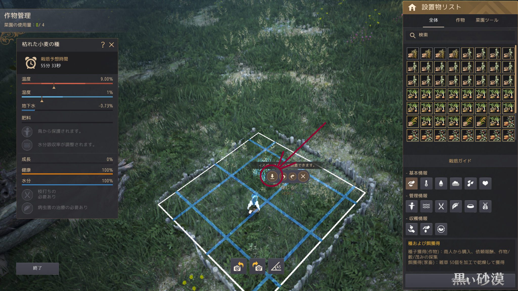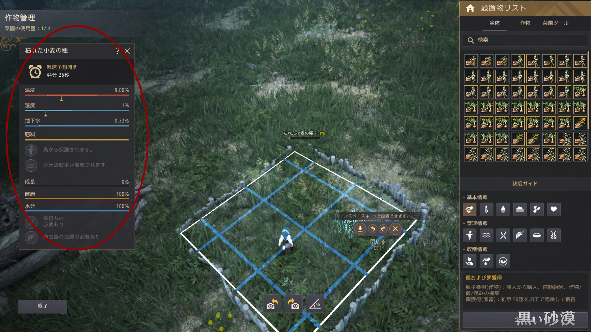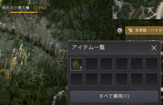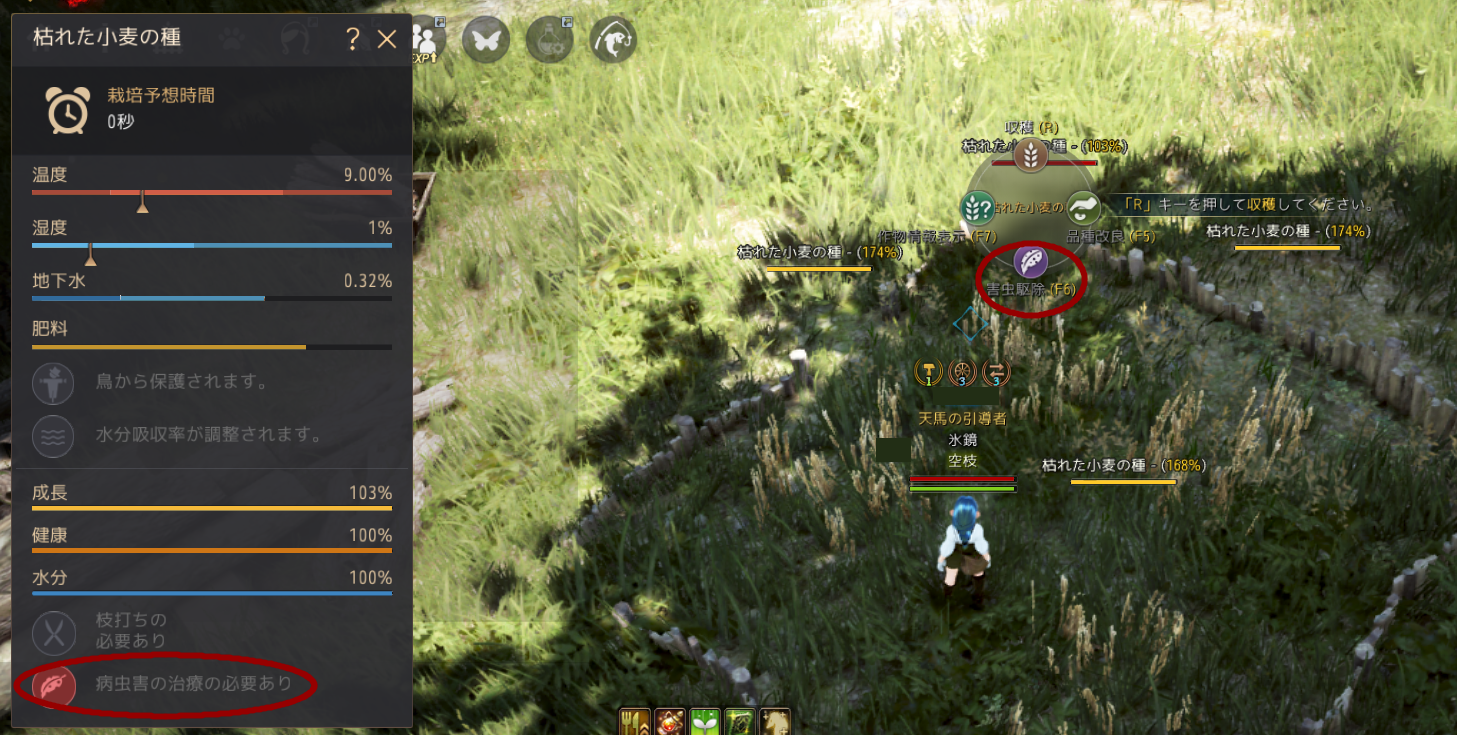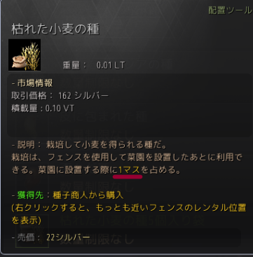 こういうふうに「枯れた小麦の種」を植えたところから「小麦の種」という一つ上の種を手に入れられたりします。(難易度はそれなりにあるので、すぐに採れるという感じでもないです)