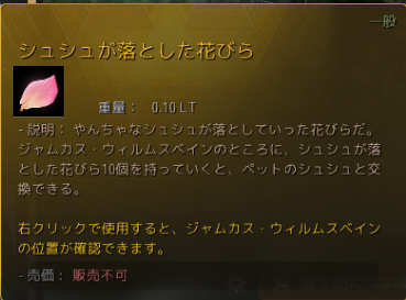 この花びらを10集めると、ペットのシュシュが獲得できます。残念ながら特別な能力はなにもないのですが……。