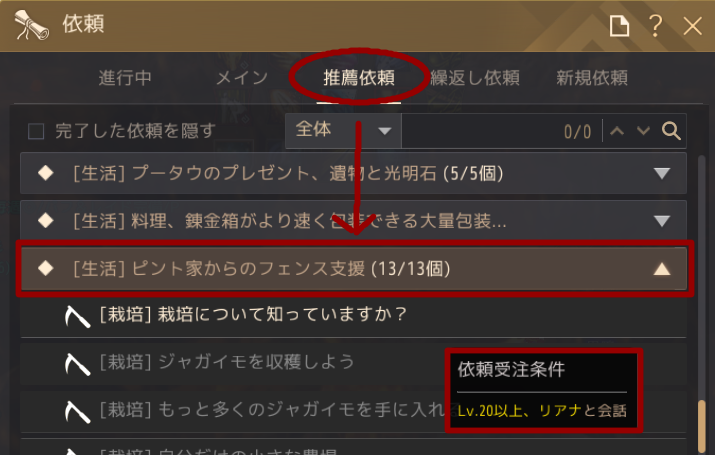 Oキー依頼一覧から、推薦依頼→[生活]ピント家からのフェンス支援、です。