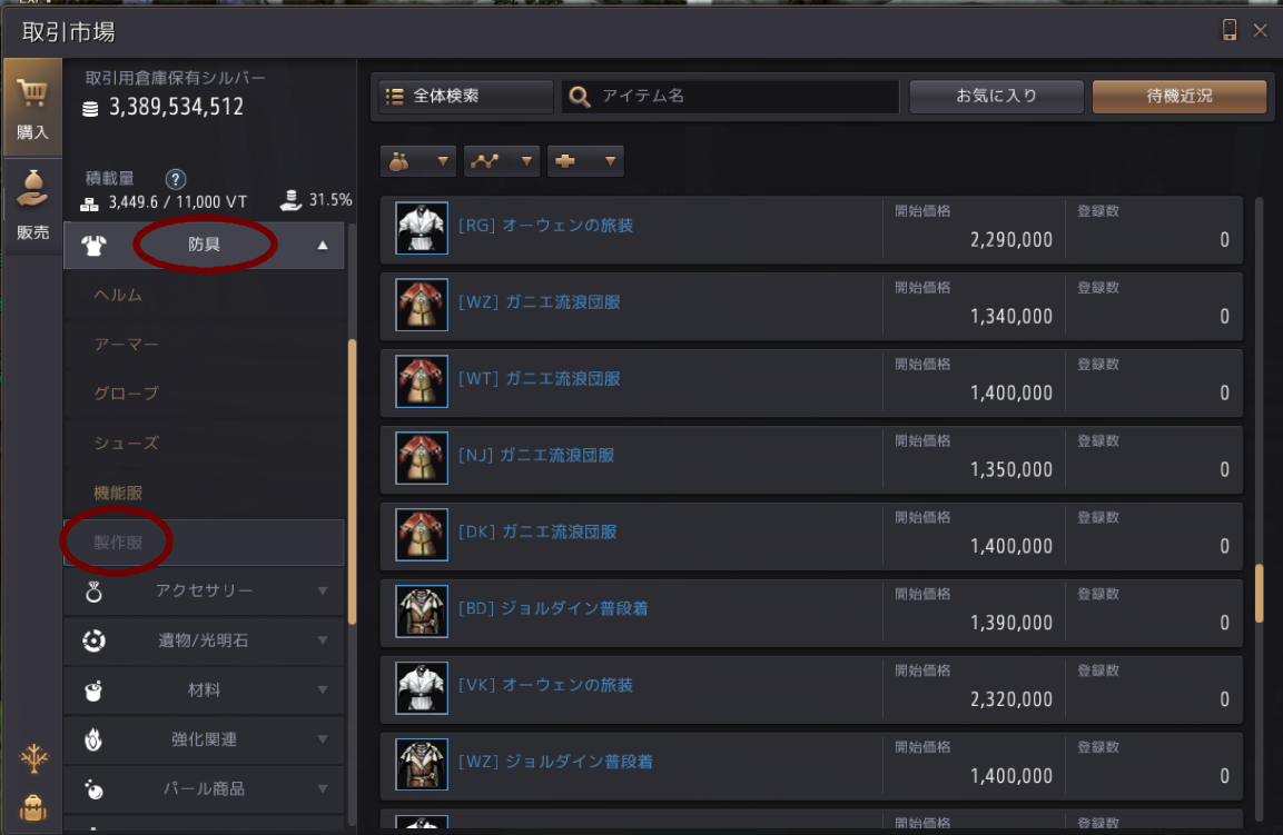 ただこれが実装されたのはわりと初期で、今はあまり需要もないため、カルフェオン貴族服を除くと出品は少ないです。