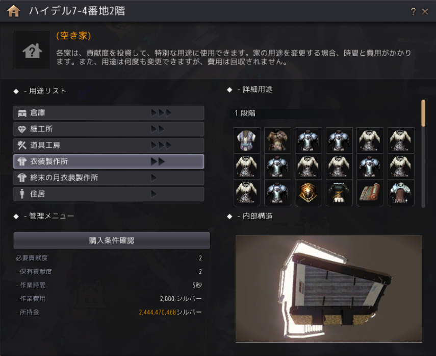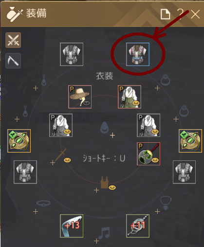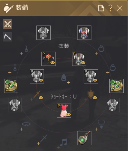 ・労働者に作らせたり(製作服)、高級品商人から購入した(機能服)衣装を、アバターのスロット(内側のサークル)に装備できるようにする