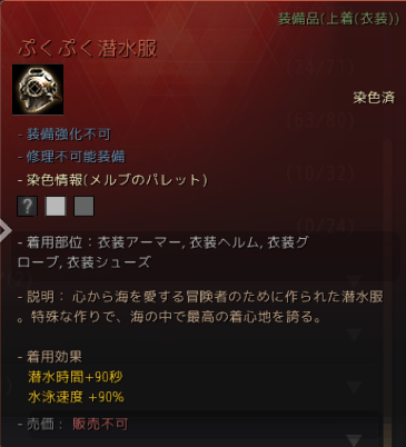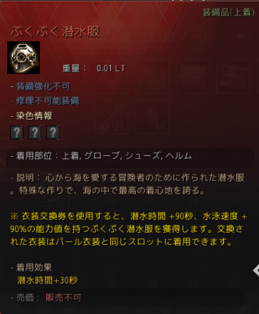 ほぼ全ての衣装は1回着たらそのままそのキャラクターに帰属して、他のキャラでは着られなくなりますが、ぷくぷく潜水服はそうではありません。水泳/潜水用として家門全員で着回しができます
