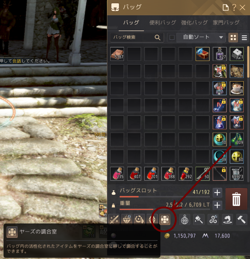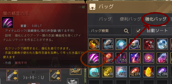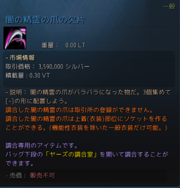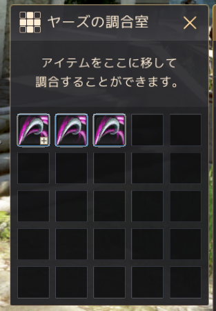 この「闇の精霊の爪の欠片」を3つ手に入れて、バッグ内ヤーズの調合室から