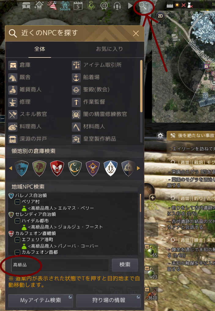 通常画面右上のルーペアイコン「NPC検索」から、高級品で