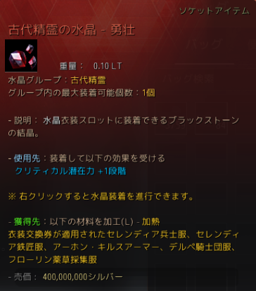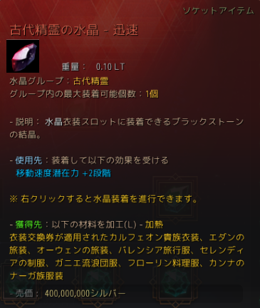 私はクリティカル潜在力は料理や水晶などで上げやすいため、移動速度のほうを使っています。取引所にあまっている、カルフェオン貴族服の衣装化&加熱で手に入ります。
