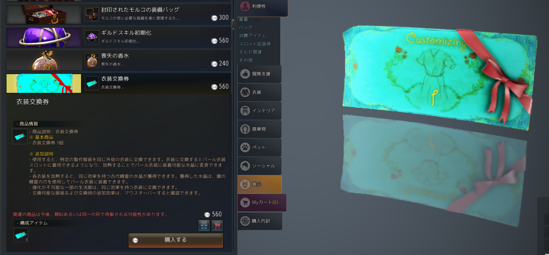 あと、衣装交換券は取引所のパール品から買うことも出来ます。ただし、今回配られるものは[EV]とついているのでおそらく出品は不可能です。