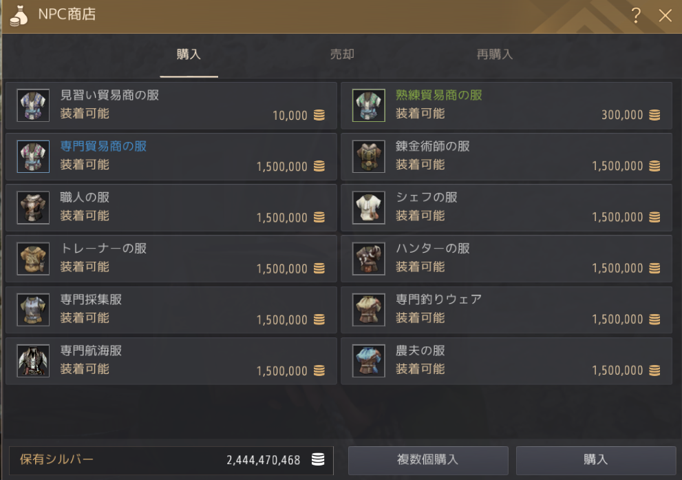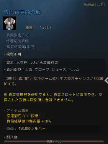※ただし装備条件があるのでお気をつけください。これより条件が緩い代わりに交渉回数増加も少ない下位の貿易服も売っています。