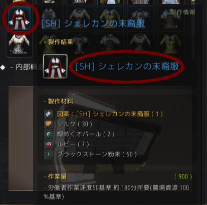 このような材料が必要です。特に「図案」というアイテムが重要なのですが、これは依頼を通して入手したり、NPCから取ったりといろいろな方法があるので詳しくは検索してください(すみません、全部書こうとすると記事が無茶苦茶長くなるくらいに種類があるのです)