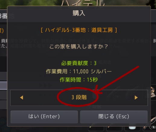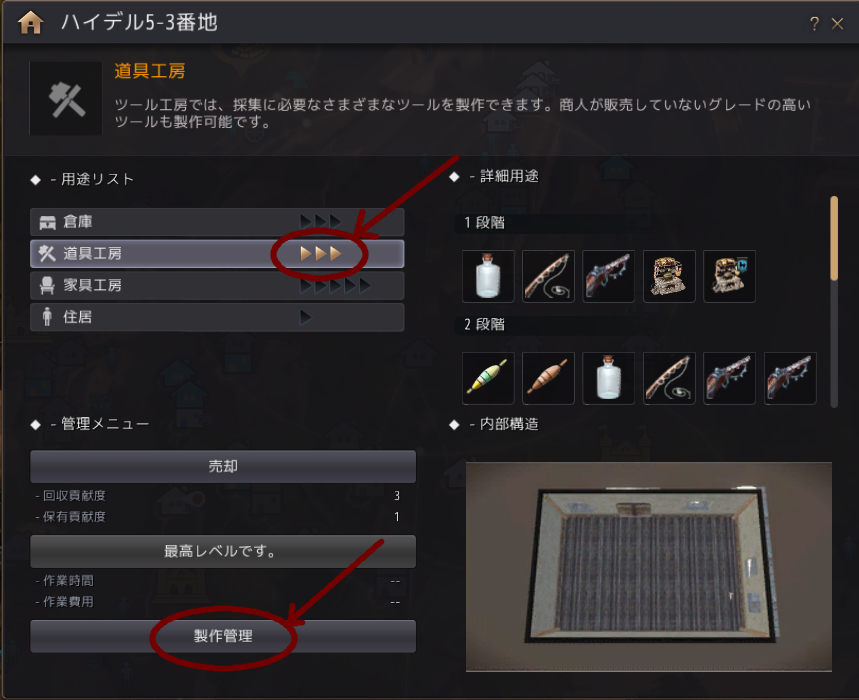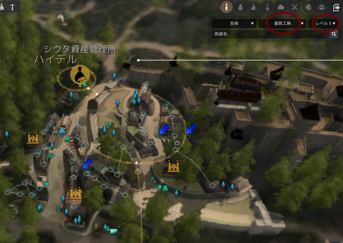 画面右上で「道具工房」、「レベル3」を選んで、ピックアップされた場所からどの建物を借りるか決めて、道具工房を確保することになります。
