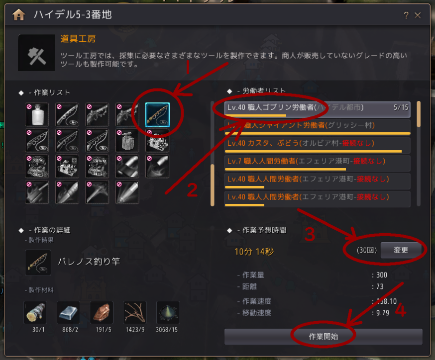 注意としては労働者は自分が居る街の倉庫から材料を持ち出しますので、この場合はハイデルですが、例えばベリアから労働者を派遣した場合、材料はベリアの倉庫に入っている必要があり、完成した釣り竿もベリアの倉庫に入ります。この時、ハイデルとベリアは拠点接続されている必要があります。