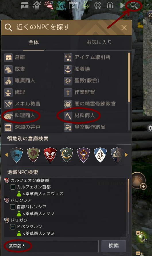 薬草商人、材料商人、料理商人などは通常画面右上のルーペアイコン「NPC検索」から。